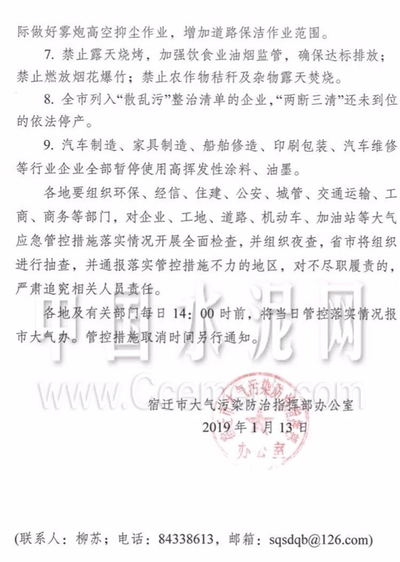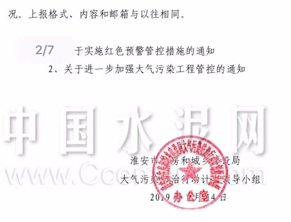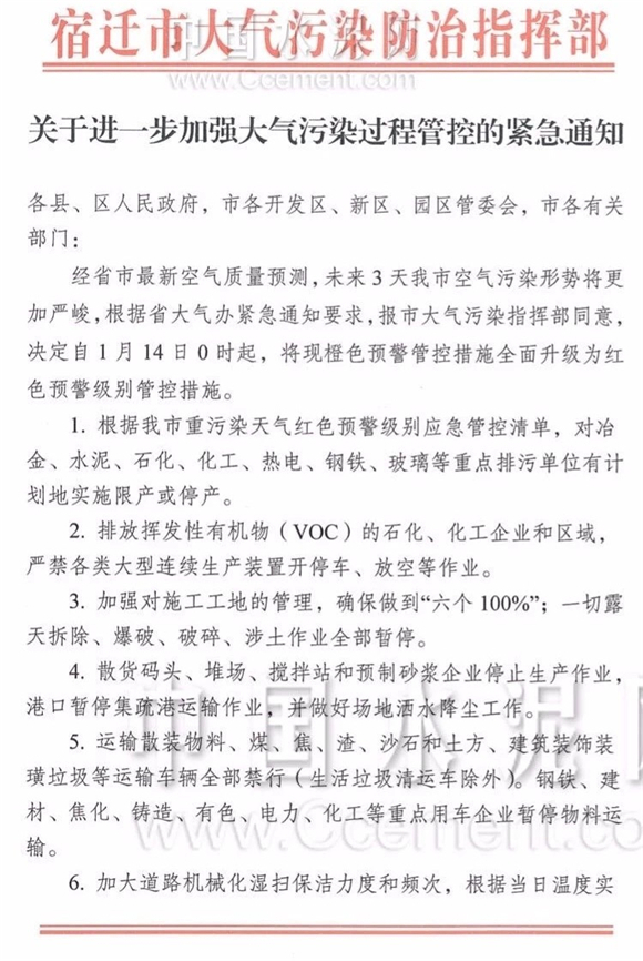 據中國水泥網獲悉,13日,宿遷市大氣污染防治指揮部發布《關于進一步加強大氣污染過程管控的緊急通知》,《通知》稱:經省市最新空氣質量預測,未來3天我市空氣污染形勢將更加嚴峻,根據省大氣辦緊急通知要求,報市大氣污染指揮部同意,決定自1月14日0時起,將現橙色預警管控措施全面升級為紅色預警級別管控措施。