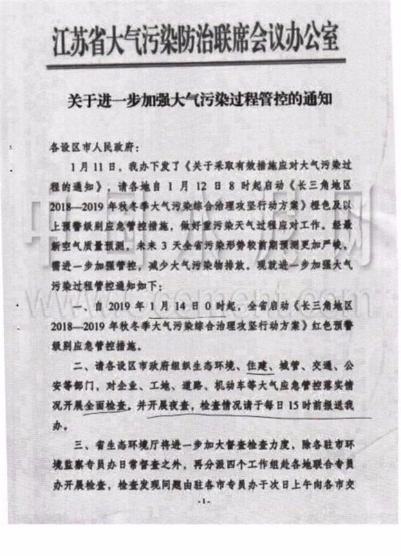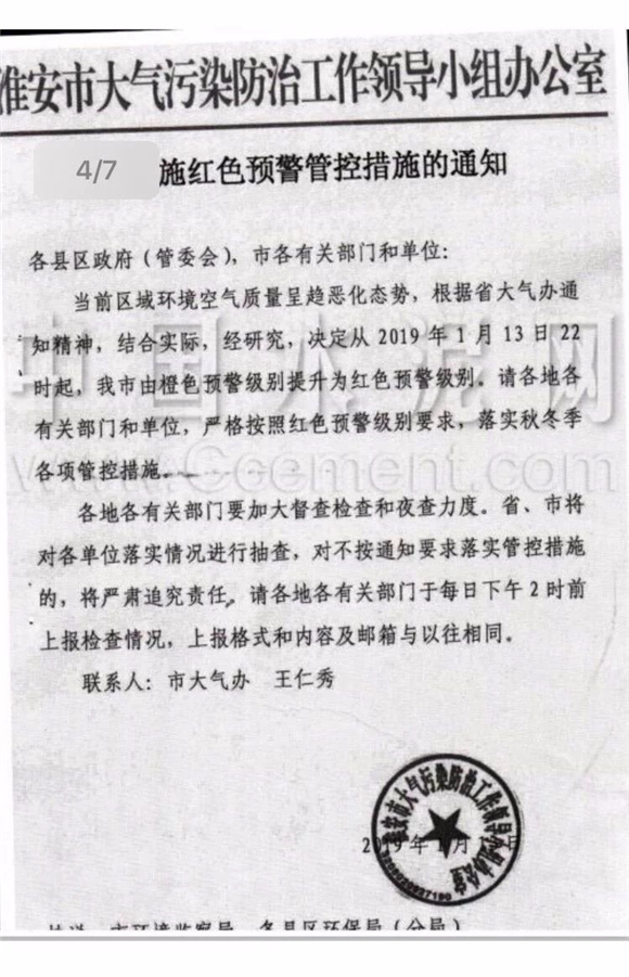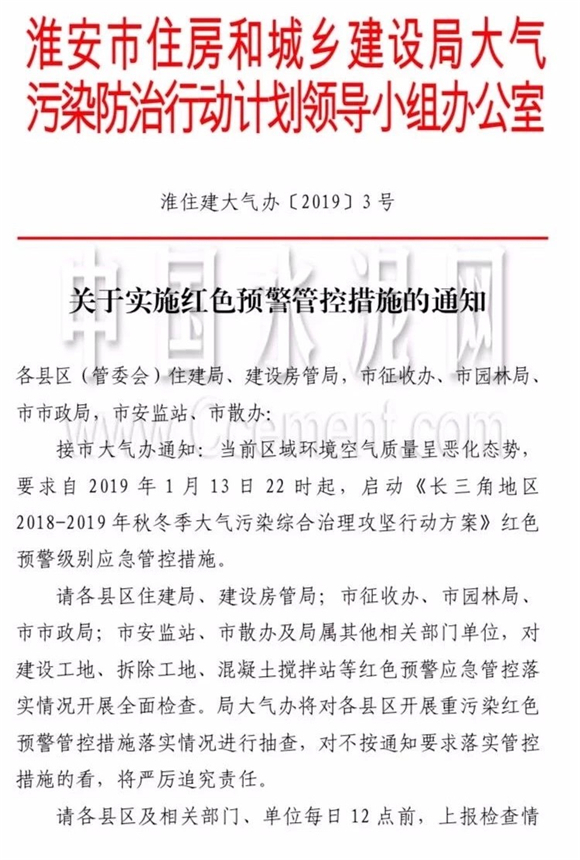 同日,淮安市淮住建大氣辦發布《關于實施紅色預警管控措施的通知》,通知稱:當前區域環境空氣質量呈惡化姿態,要求自2019年1月13日22時起,啟動《長三角地區2018-2019年秋冬季大氣污染綜合治理攻堅行動方案》紅色預警級別應急管控措施。